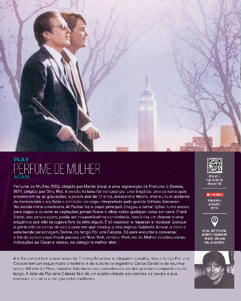 Como um almanaque, o calendário documentou através da trilha sonora, 24 filmes de grande sucesso ao longo da história do cinema, e contou com 24 cartões com as principais cenas dos respectivos filmes. Além de links via QR Code: para o trailer de cada filme no Youtube e para ouvir as música pelo Spotify. Além de curiosidades a respeito dos compositores das trilhas sonoras e de um mapa com a indicação do local onde foi filmada cada cena famosa.