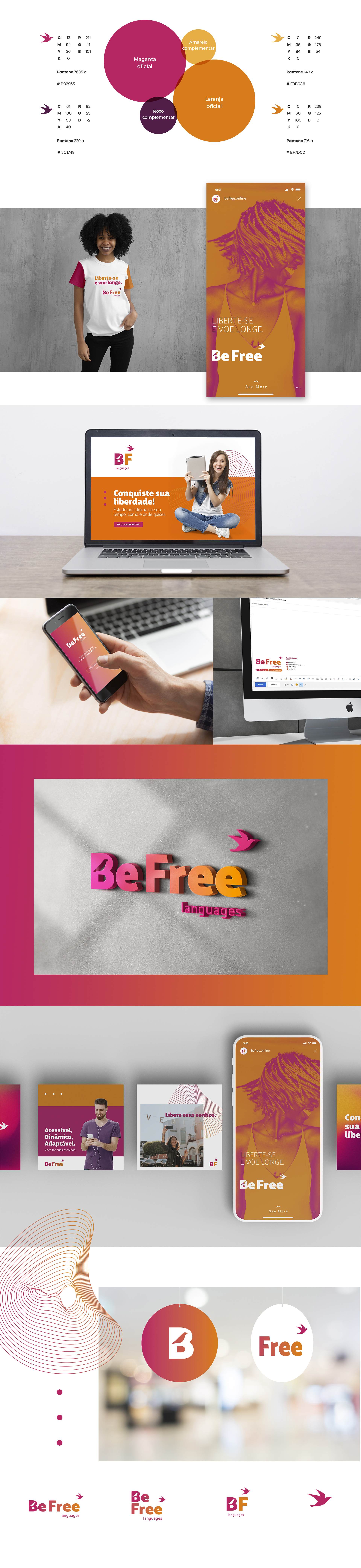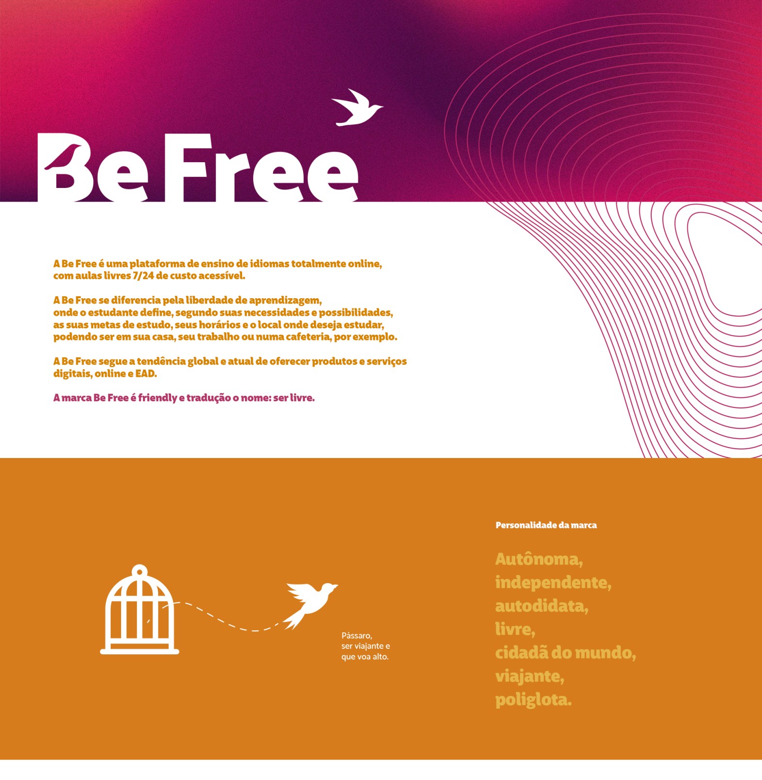 A My Target necessitava do logo e da identidade visual para sua nova marca no ensino de idiomas, a Be Free, uma plataforma de ensino a distância disponível para todo o mundo. Desenvolvi o logotipo, a identidade visual, além de alinhar o posicionamento da marca, seus atributos e definir sua tagline – Liberte-se e voe longe.