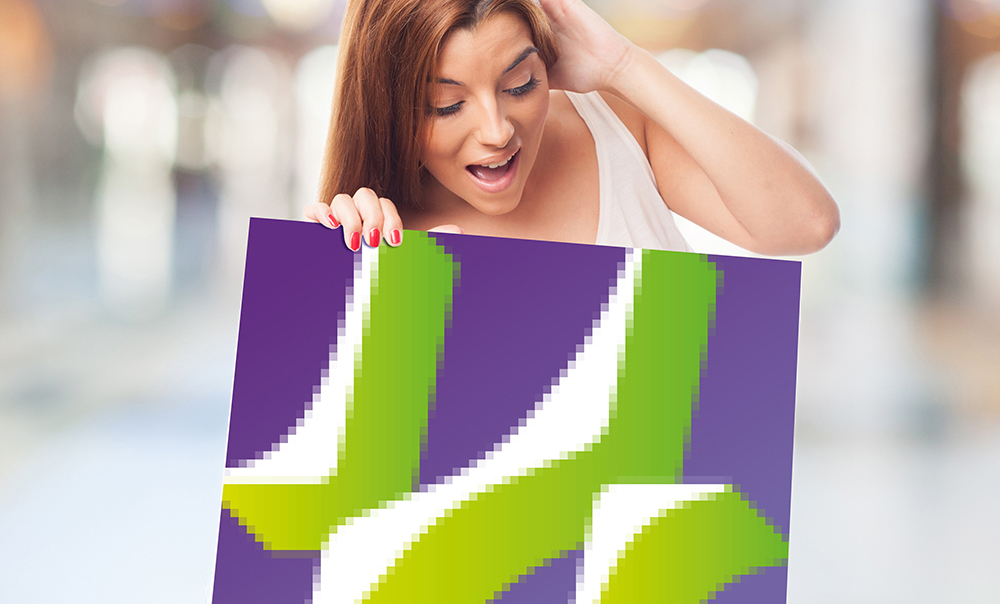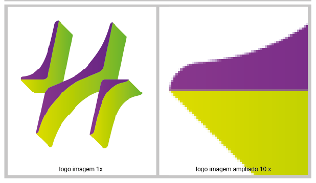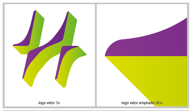 Por isso é de extrema importância você ter disponível a versão vetor de sua marca e dos elementos visuais que a compõem. Não só os logotipos, mas ícones, ilustrações, ou qualquer outro elemento gráfico que componham o layout, podem ser redimensionados sem perder a qualidade.