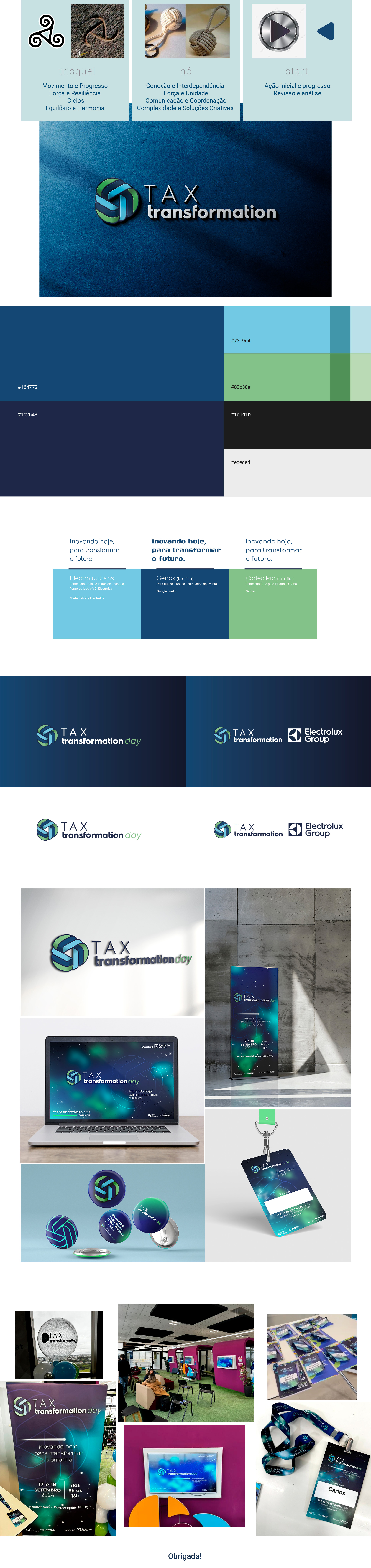 O time do departamento tributário do Grupo Electrolux nos trouxe a missão de criar a identidade visual para o Tax Transformation Day, em setembro de 2024. Um evento para a melhoria de processos, inspiração e visão de futuro do time. Nosso desafio foi criar uma identidade única e inspiradora, onde aplicamos os conceitos de movimento, progresso, ciclos, força, união, ação e conexão, tudo isso sem desconectar com a identidade mãe do Grupo Electrolux.